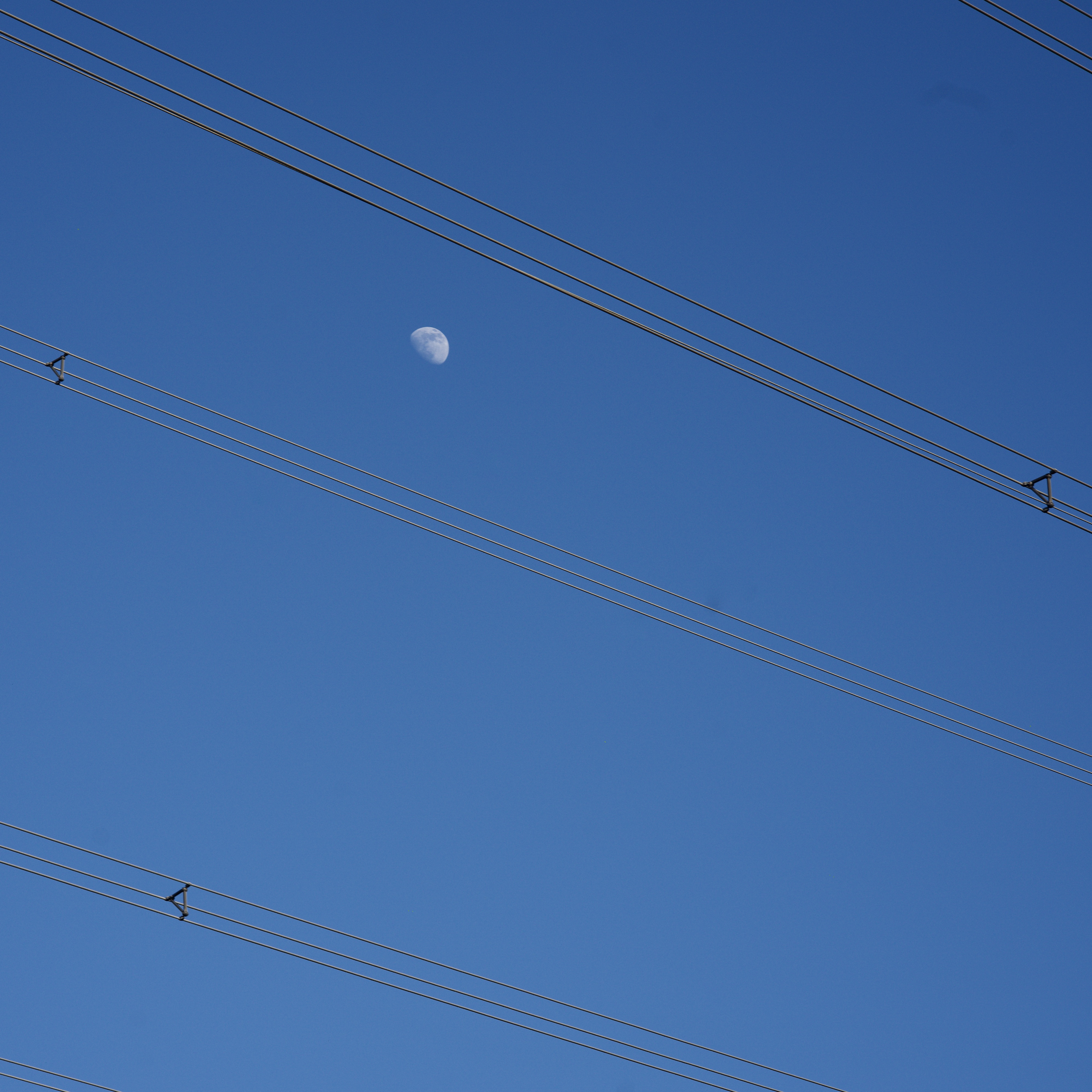 cables of a power line in front of the blue sky, with the blurred moon in the background